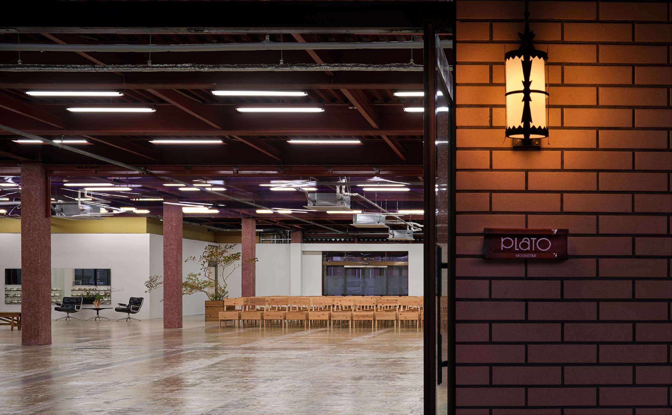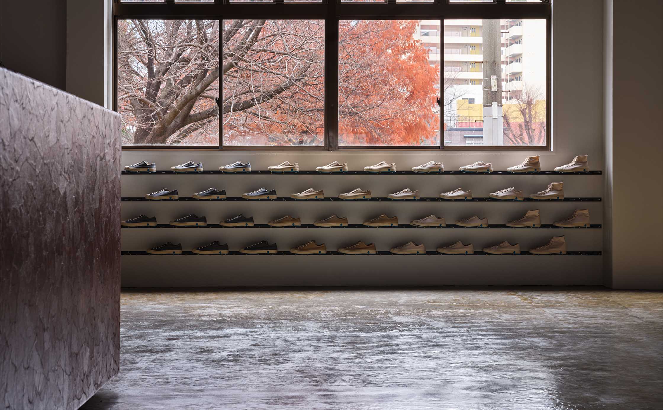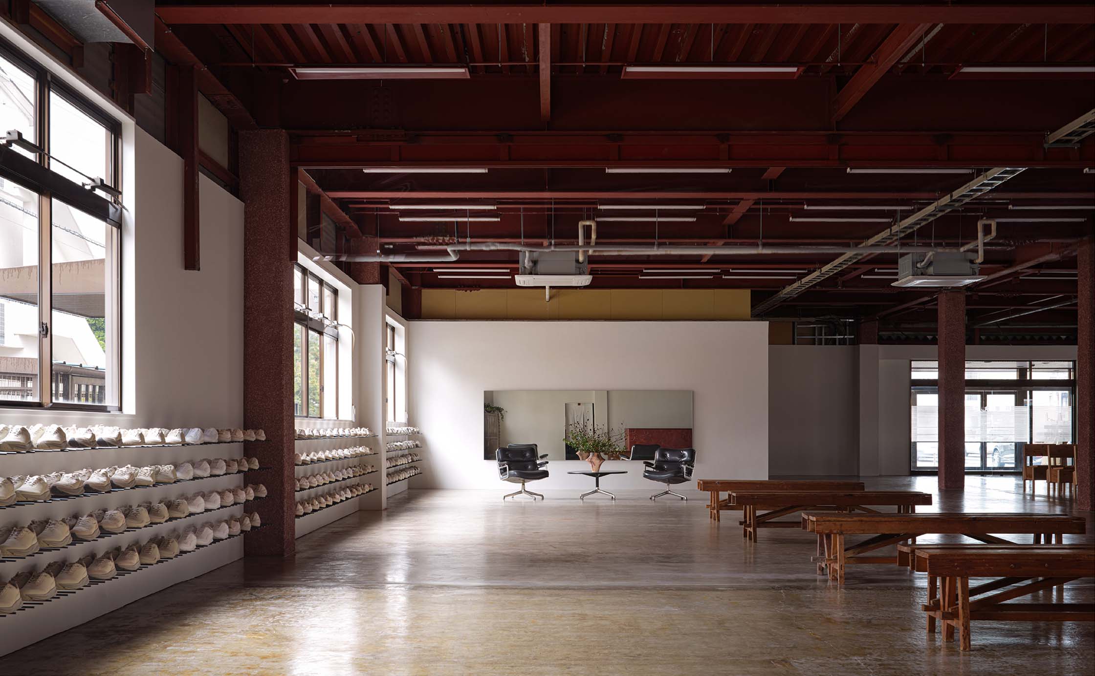 PLATO MOONSTARは、多様な商品やコンテンツを受けとめる、ひらかれた大空間として設計しています。躯体の雰囲気を活かし、和紙を用いた一閑張りのカウンターや、約22mにわたる自社製の陳列棚を空間の軸としました。多くの什器は用途に合わせて動かし、使い続けられる可動式。行商に使用されていた古い木箱や、かつて社内でつくられ長く愛用されてきたベンチなど、使われてきた時間に価値を見出した備品も取り入れています。社員の手で新たにつくられた机や椅子も並ぶこの空間は、ムーンスターの「つくり、使い、育てていく」ものづくりの姿勢を体現しています。