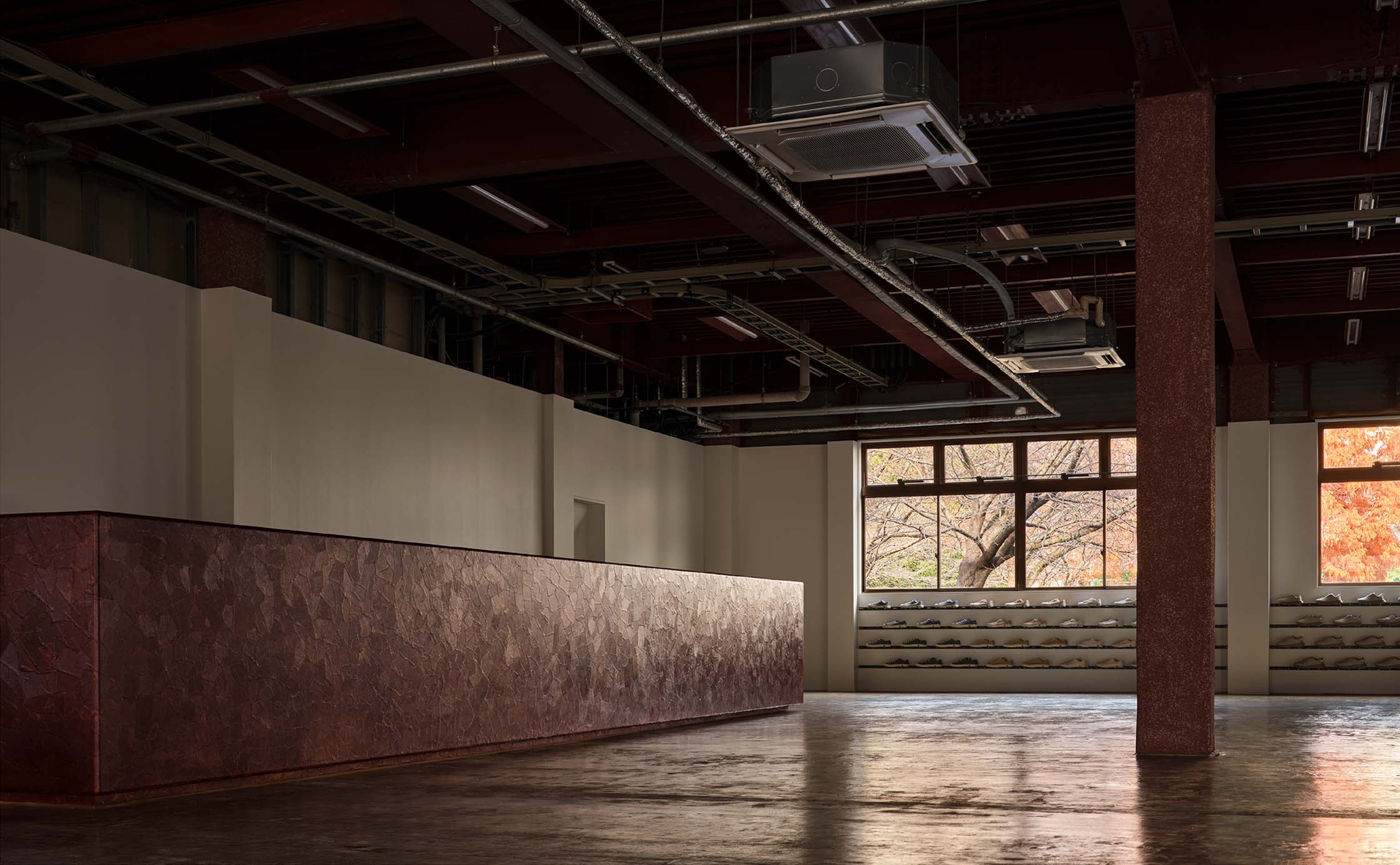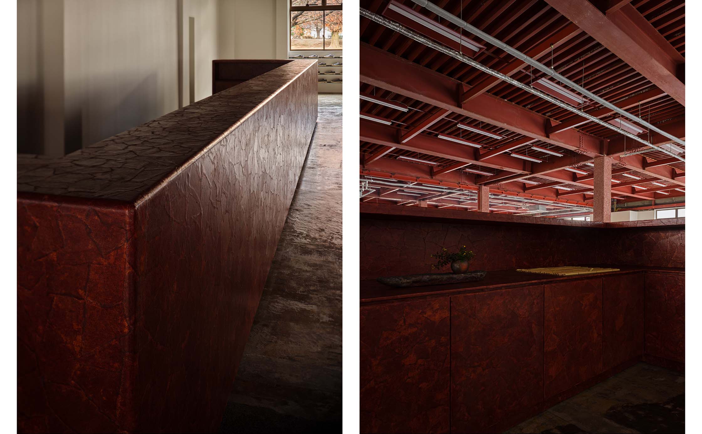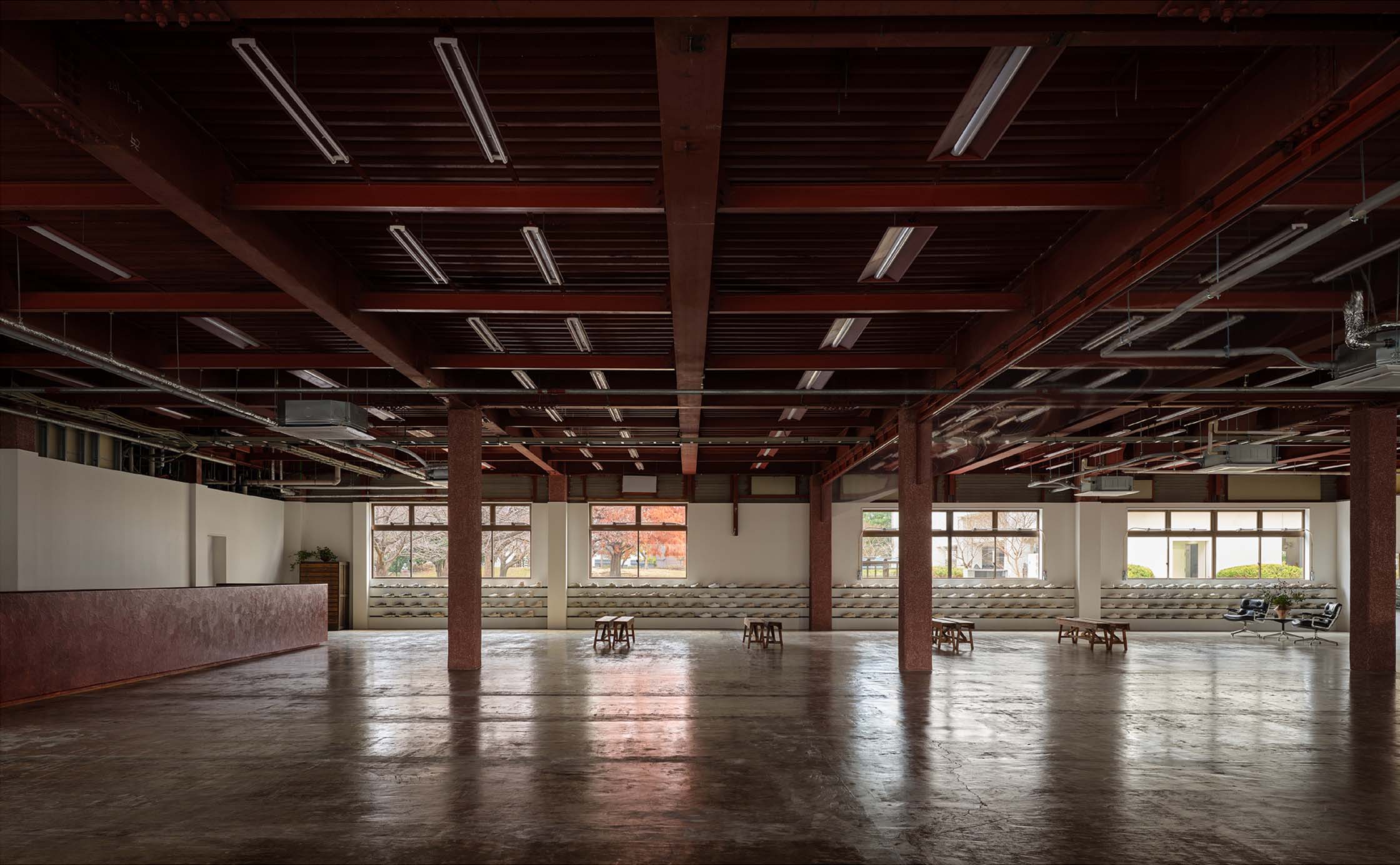 PLATO MOONSTARは、多様な商品やコンテンツを受けとめる、ひらかれた大空間として設計しています。躯体の雰囲気を活かし、和紙を用いた一閑張りのカウンターや、約22mにわたる自社製の陳列棚を空間の軸としました。多くの什器は用途に合わせて動かし、使い続けられる可動式。行商に使用されていた古い木箱や、かつて社内でつくられ長く愛用されてきたベンチなど、使われてきた時間に価値を見出した備品も取り入れています。社員の手で新たにつくられた机や椅子も並ぶこの空間は、ムーンスターの「つくり、使い、育てていく」ものづくりの姿勢を体現しています。