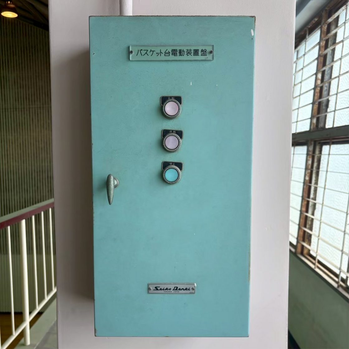 今年6月に閉館した月星体育館内に設置されていた装置盤。約60年前に建てられただけあって、その全てがレトロな佇まいでした。